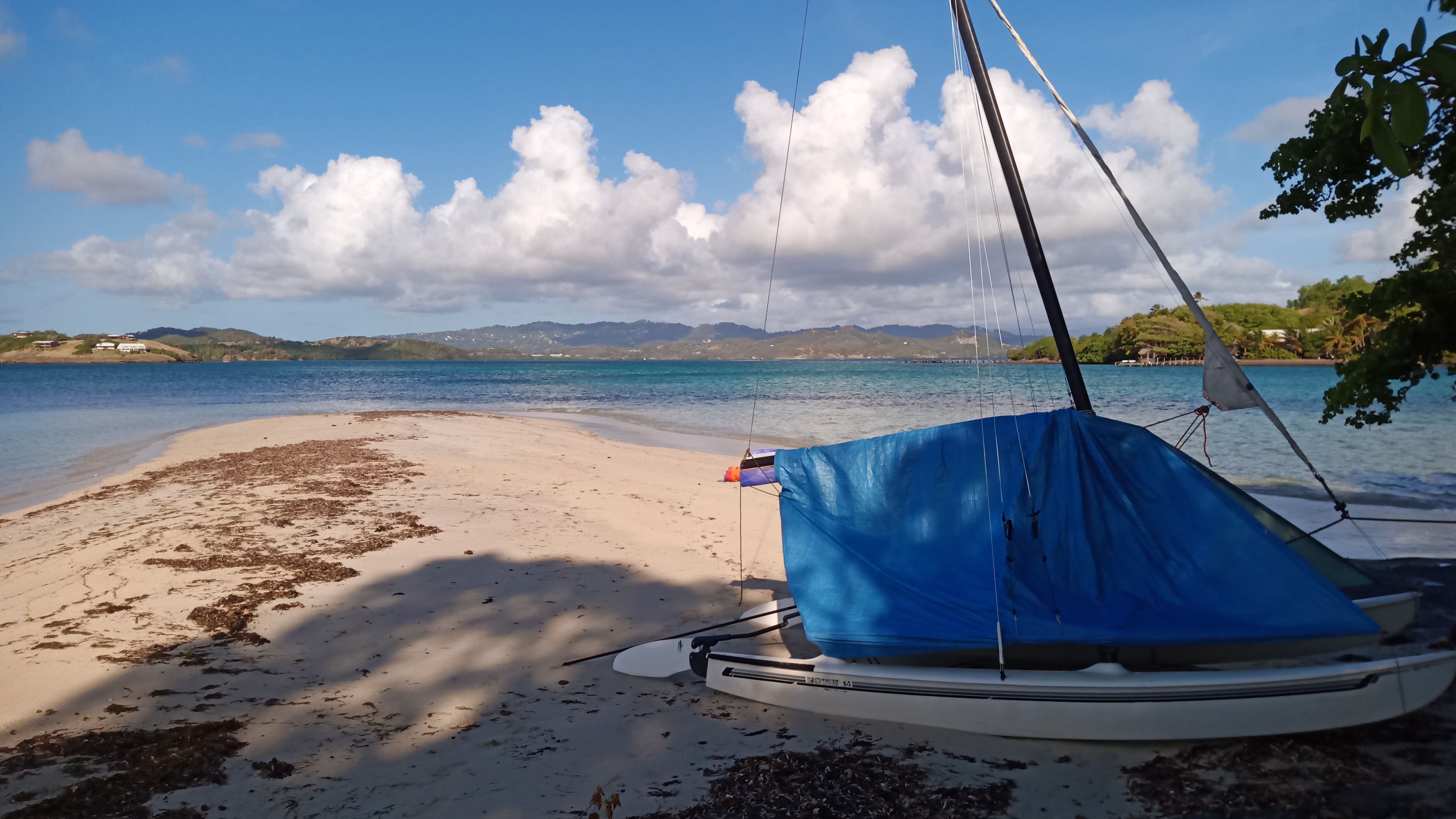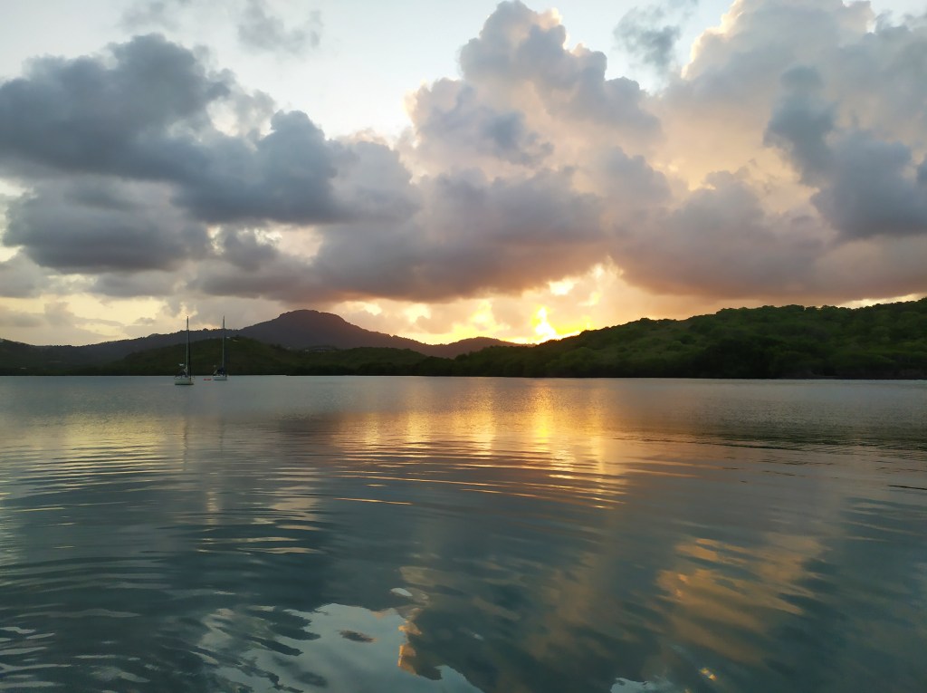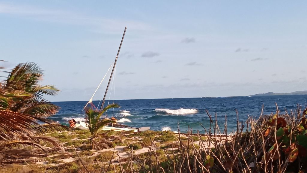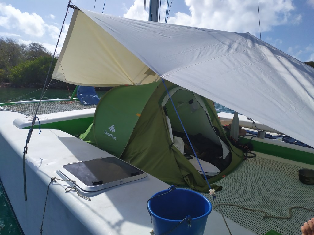 Nous dormons sur le catamaran cette nuit, après avoir tendu une bâche au-dessus. L’image est belle au réveil : au premier plan le banc de sable et le lagon, au second la Martinique qui s’éveille…