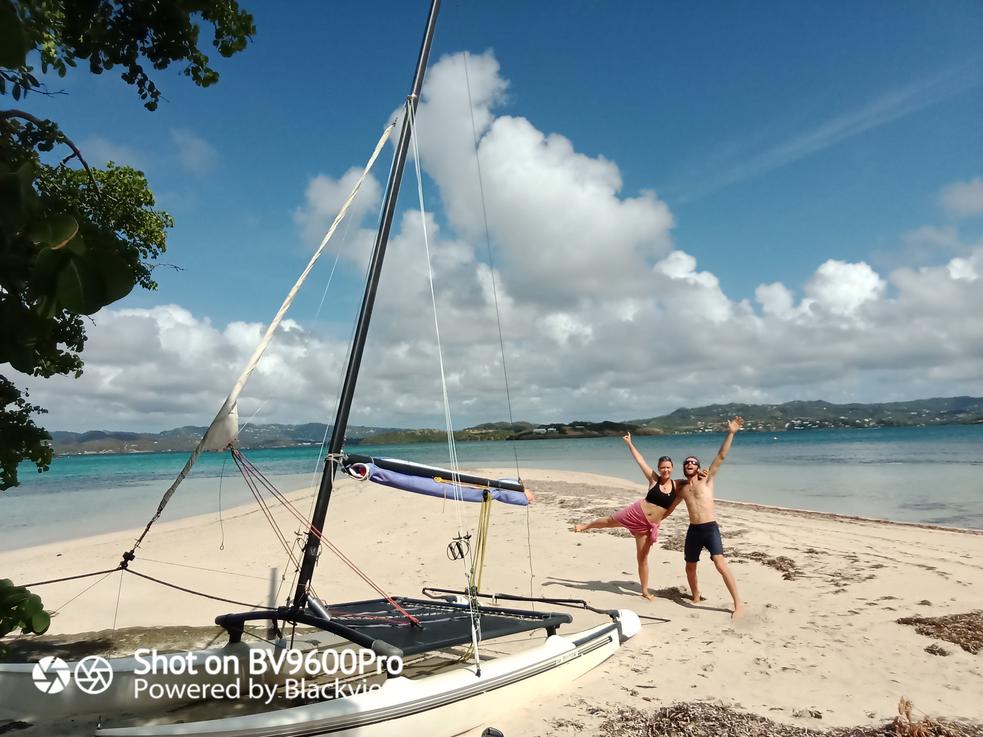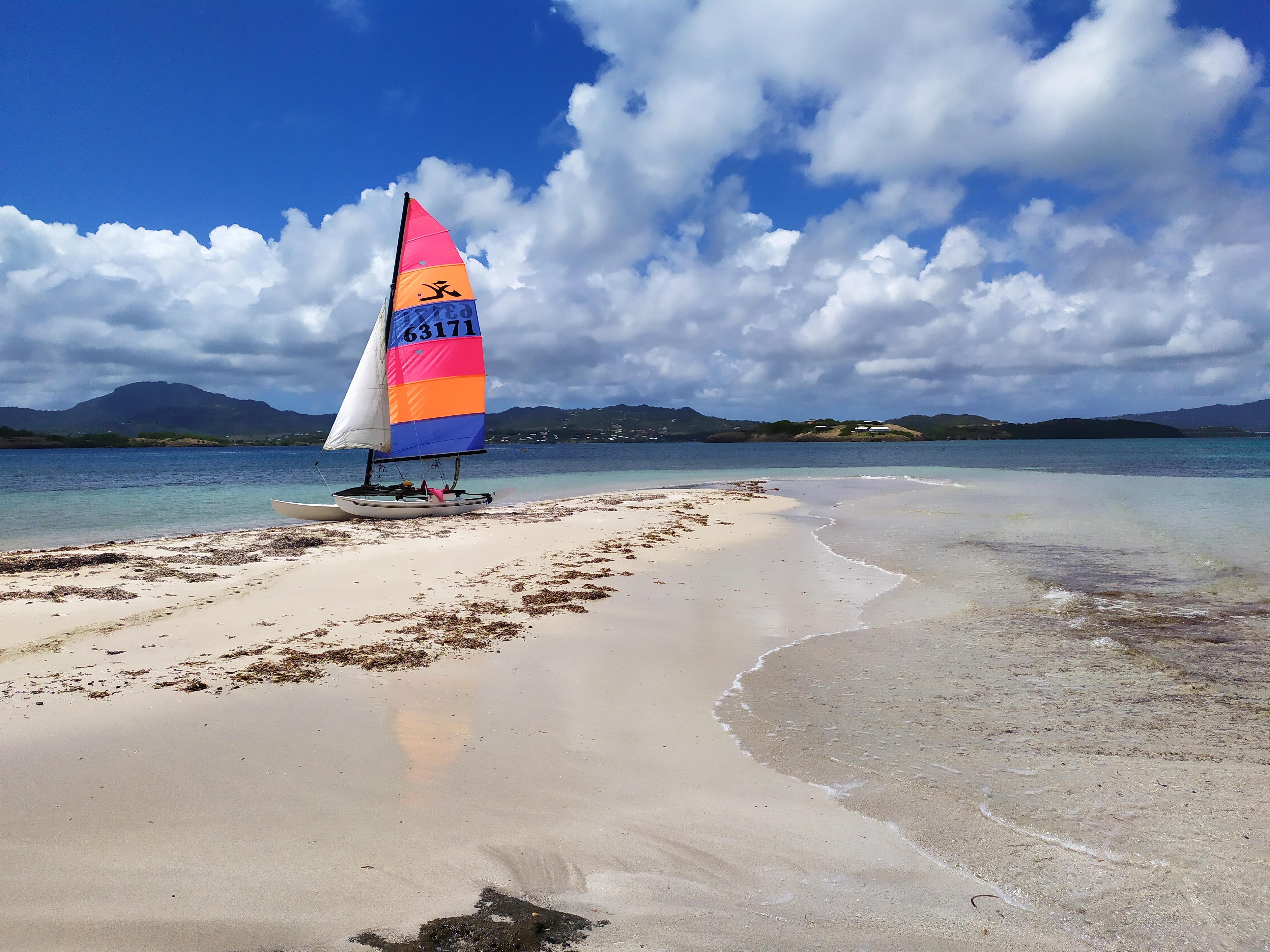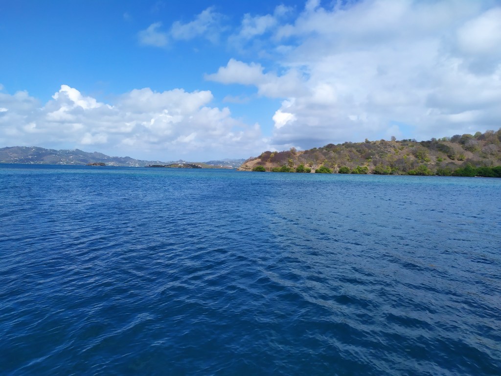 Nous dormons sur le catamaran cette nuit, après avoir tendu une bâche au-dessus. L’image est belle au réveil : au premier plan le banc de sable et le lagon, au second la Martinique qui s’éveille…