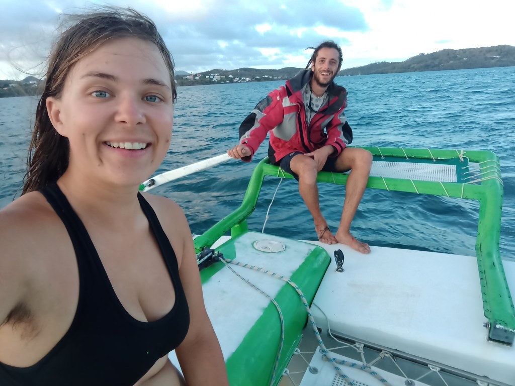 Peu après le départ, je constate que je n’ai pas du tout confiance en ce bateau. On s’est rendu compte que la poutre centrale était en mauvais état, donc j’ai peur que le bateau casse à chaque vague (bon apparemment on est quand même loin de la scission mais mes peurs sont souvent irrationnelles). J’ai confiance en mon capitaine, c’est déjà ça !