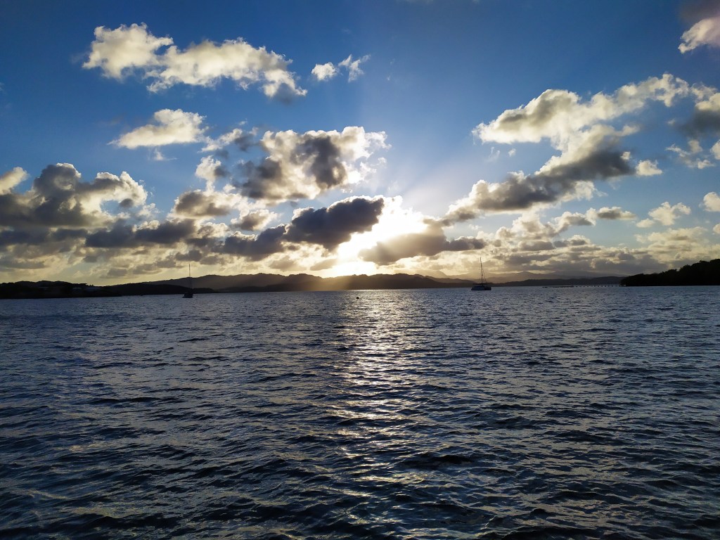 Hier matin, nous avons vu une policière municipale à bord d’un bateau nous prendre en photo, sans nous dire bonjour ou nous demander la permission. L’après-midi, nous étions en photo dans Martinique Première (le TF1 local), dans un « article » diffamatoire et encourageant la délation envers les plaisanciers qui soi-disant se rendent à terre avec leur annexe et ne respectent pas les règles sanitaires. Pour nous qui n’avons pas d’annexe à proprement parler et n’avons pas touché terre depuis deux semaines, on a moyennement apprécié. D’autant plus que les plaisanciers vont à terre pour faire leurs courses, eux aussi ! Apparemment il est commun en Martinique que des gens se plaignent du comportement de untel ou unetelle, juste pour… le plaisir ? Je ne rentre pas dans les détails de cette histoire plutôt dénuée d’intérêt, mais elle a plongé Ludo dans un gros spleen et une volonté de fuir l’humanité. Deux phrases plus tard, nous nous imaginons à bord d’un voilier pour faire le tour du monde (et on n’avait pas bu de rhum cette fois !)…