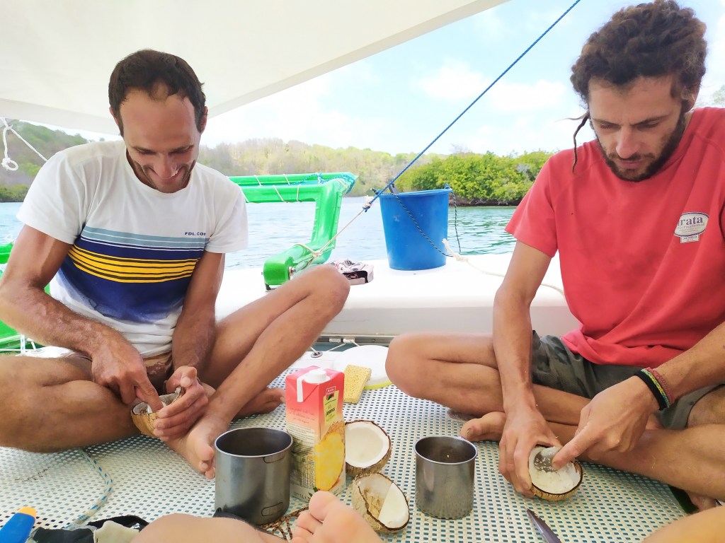 Il y a trois jours, un petit monocoque a débarqué au mouillage, de nuit, si proche du récif qu’on s’est dit qu’il connaissait forcément le coin comme sa poche ! Que nenni ! Julien arrivait de sa traversée depuis le Brésil et venait de passer presque trois semaines sans aucun contact humain. Du coup on passe un peu nos journées avec ce français qui vient de passer 13 ans au Brésil et qui nous offre de la cachaça au fruit de la passion. Il nous fait découvrir des crêpes particulières à partir de farine de manioc ainsi que la cocada, un dessert brésilien à base de noix de coco, de sucre et de lait.