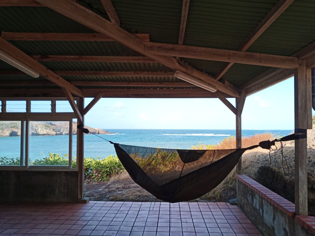 Première nuit à Grosse Roche : le bateau est face à la mer, offrant une opportunité sans pareille au vent de s’engouffrer sous la bâche. Le brouhaha incessant empêche Ludo de dormir, il part tendre son hamac dans la forêt. Une énorme averse éclate alors, l’eau rentre sous la bâche, je m’assieds dans le seul coin sec avec mon duvet. Je ris. Ludo passe me voir, trempé lui aussi. Il termine sa nuit dans son hamac inondé. Je profite de cette insomnie forcée pour appeler ma famille et me rendors au lever du soleil. Je suis crevée et on passe la journée à quelques centaines de mètres de là, à dormir. J’ai l’impression que je pourrais ne jamais m’arrêter de dormir : ça fait une semaine que nous dormons mal et je suis épuisée ! Au retour au bateau, nous nous sommes fait voler nos duvets, mes lunettes de soleil et mon gilet de sauvetage… Un peu tristes, un peu déçus, mais on fait avec. J’espère que la personne qui les a récupérés en a plus besoin que nous. De toute façon, qu’est-ce que je faisais avec un duvet 0 degrés en plume en Martinique, hein ?