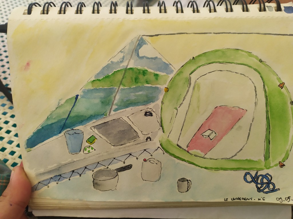 Pourquoi n’avions-nous pas une tente avec nous ? Telle est la vraie question ! Déjà parce que pendant le confinement Décath’ est fermé et fait payer 14€ la moindre livraison et je trouve ça abusé. Ensuite parce que… ben parce qu’on a fait confiance à nos savants systèmes de bâche / baule / voile / moustiquaire et qu’on a eu tort !