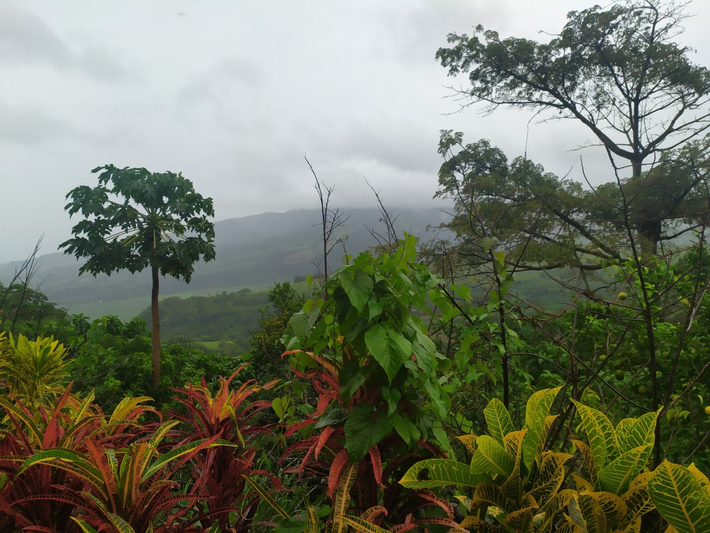 La vue depuis la maison : dans les nuages, la montage Pelée, plus haut sommet de Martinique. Et le grand arbre sur la gauche, c’est un papayer !