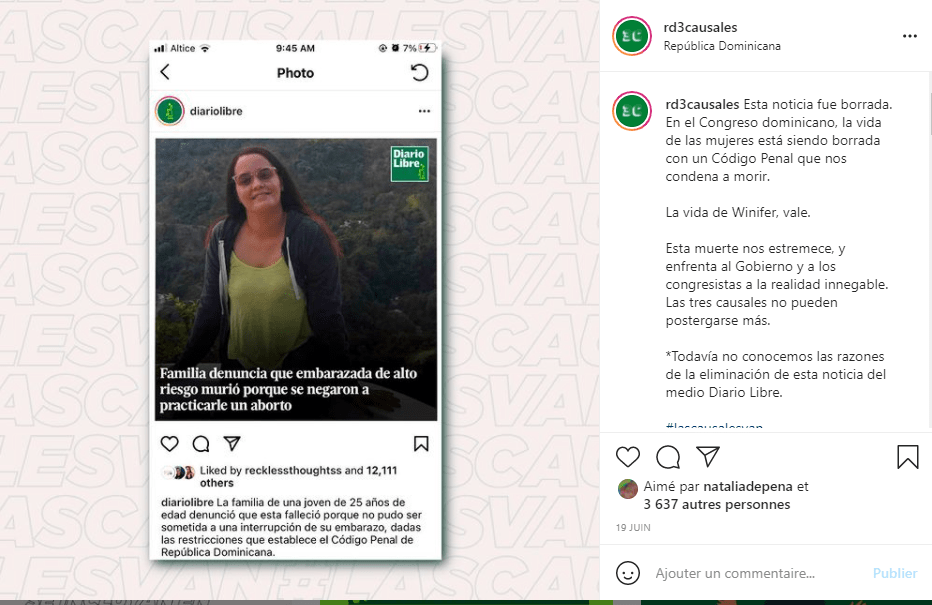 – Photo 1 : « une famille dénonce que, enceinte avec des risques élevés, elle est décédée car on a refusé de l’avorter – La famille d’une jeune femme de 25 ans a dénoncé qu’elle est décédée car elle n’a pas pu bénéficier d’une interruption de grossesse, à cause des restrictions établies par le code Pénal de République Dominicaine. »